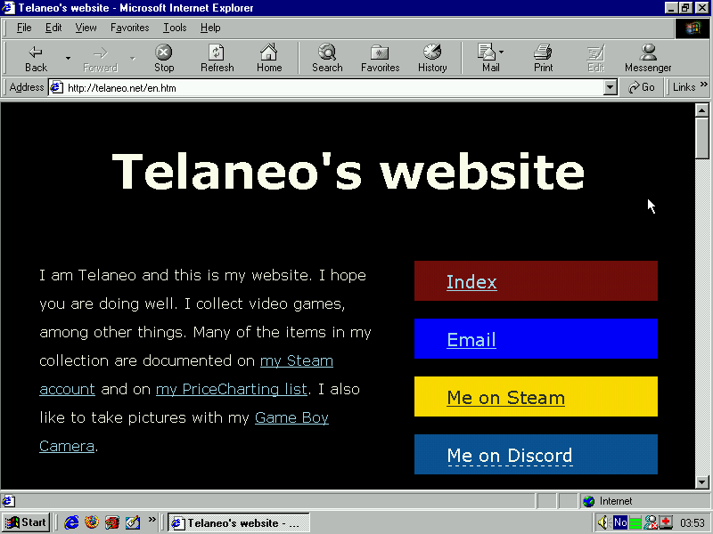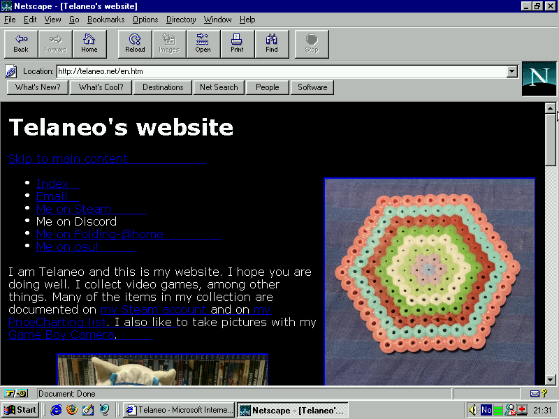Netscape Navigator 4.61. Tested on OS/2 Warp 4.52. The index loads fine, although it doesn't look great due to it's lack of proper CSS support. Loading an actual page however causes it to crash with a system error: SYS3175 (access violation, so this is a fairly generic error), which is a hilarious OS/2 failure mode. My front pages don't even have any Javascript, so this really is quite impressive. I'm assuming it crashes due to the lang attribute in my HTML tags, or something else that wasn't part of the standard when this version of Navigator was made. The index loads, as well as my error pages if you access them directly, but anything more complex crashes the same way. I could probably figure out the exact cause by making a few pages and testing them all out, but I don't intend to support this use case. Navigator 3 works on Windows without issue, so this is probably an OS/2 problem rather than a Navigator problem, if not directly, at least indirectly frogfind.com works fine and all pages work fine when viewed through it. Unicode works and images load as expected.